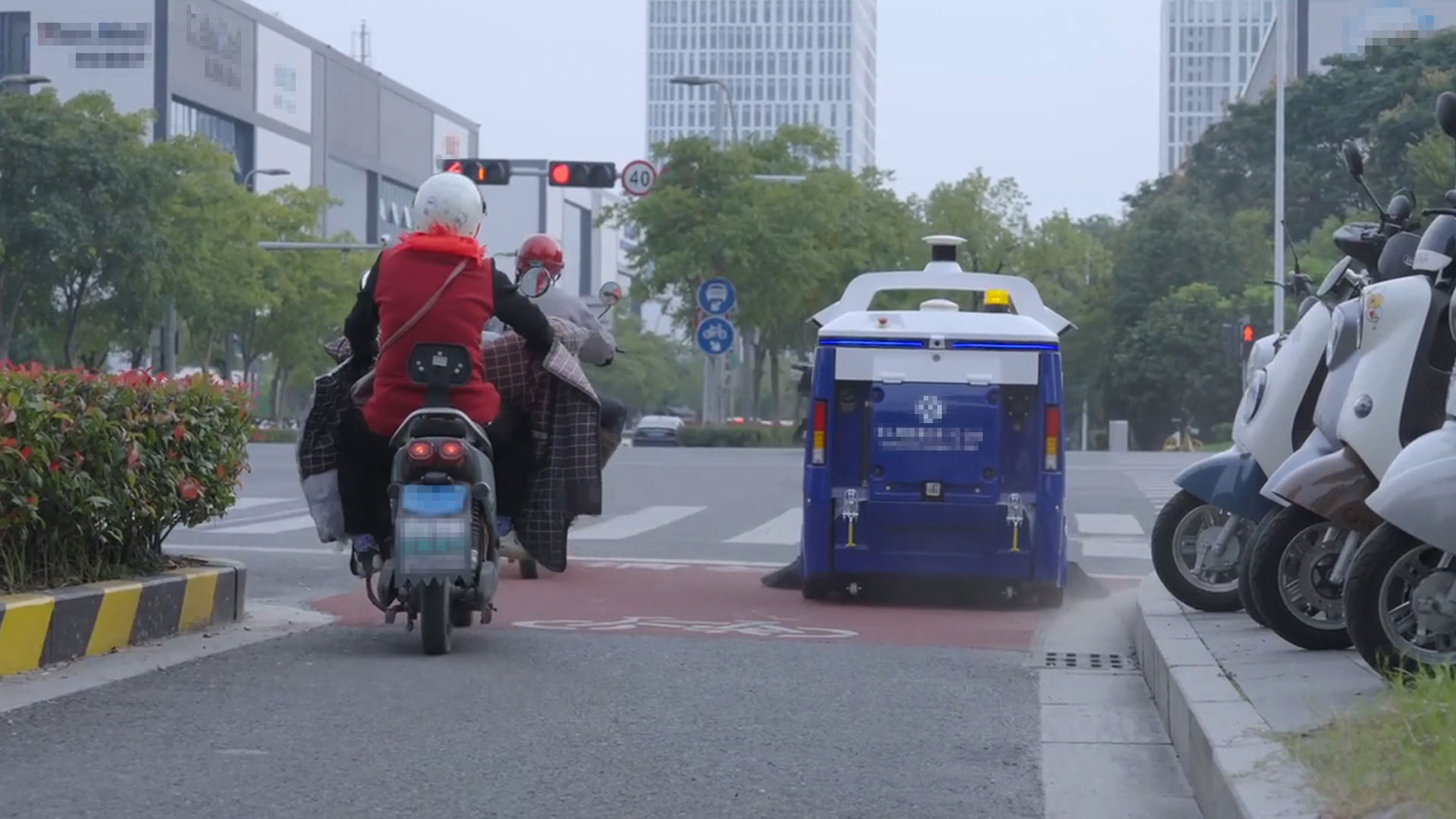 小區內有許多單人小道,會擺放許多石墩路樁進行人車分流,這考驗了無人駕駛環衛車的通行能力