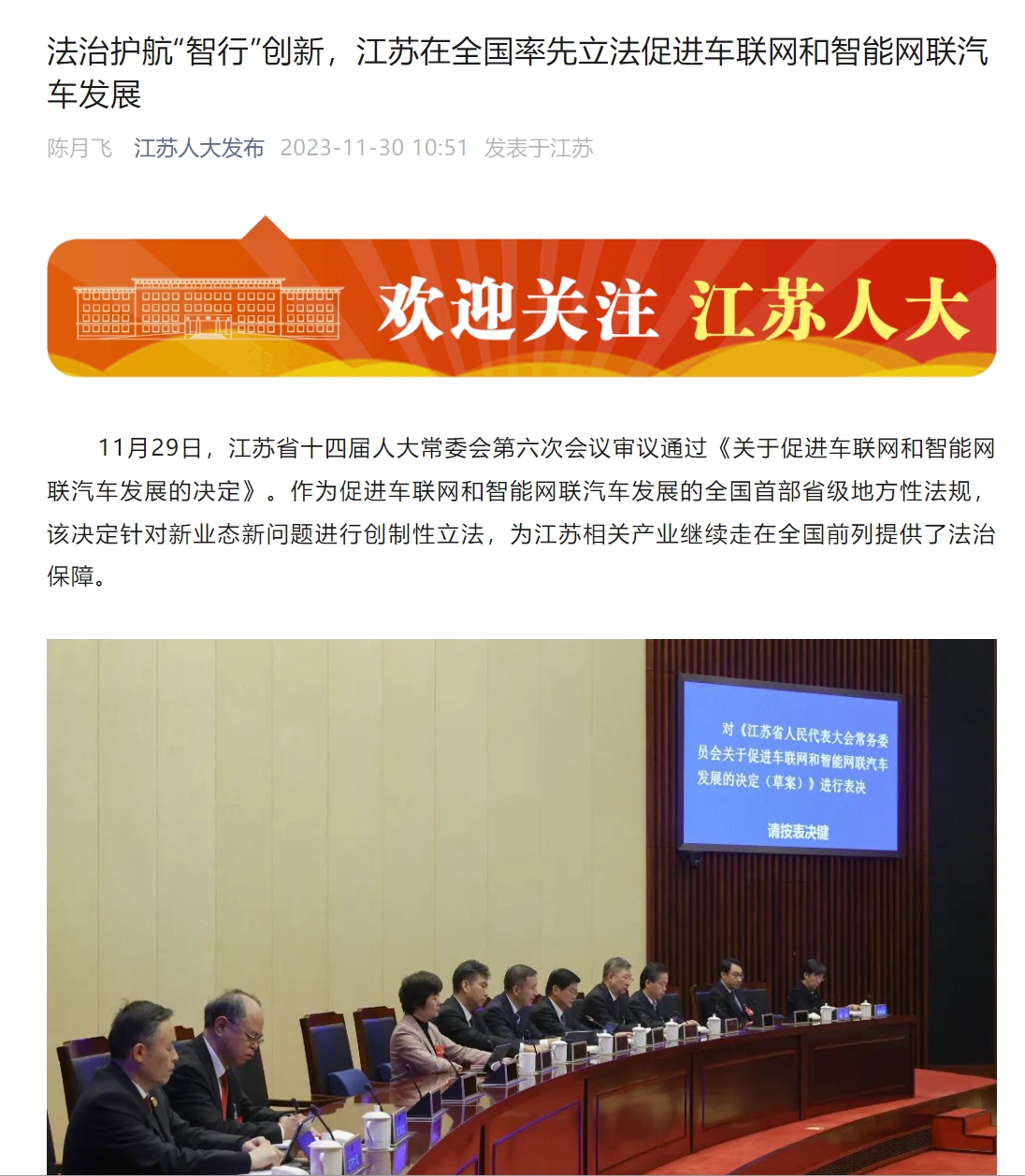 近日,江蘇省十四屆人大常委會第六次會議審議通過《關于促進車聯網和智能網聯汽車發展的決定》。作為促進車聯網和智能網聯汽車發展的全國首部省級地方性法規,該決定針對新業態新問題進行創制性立法,為江蘇相關產業繼續走在全國前列提供了法治保障。