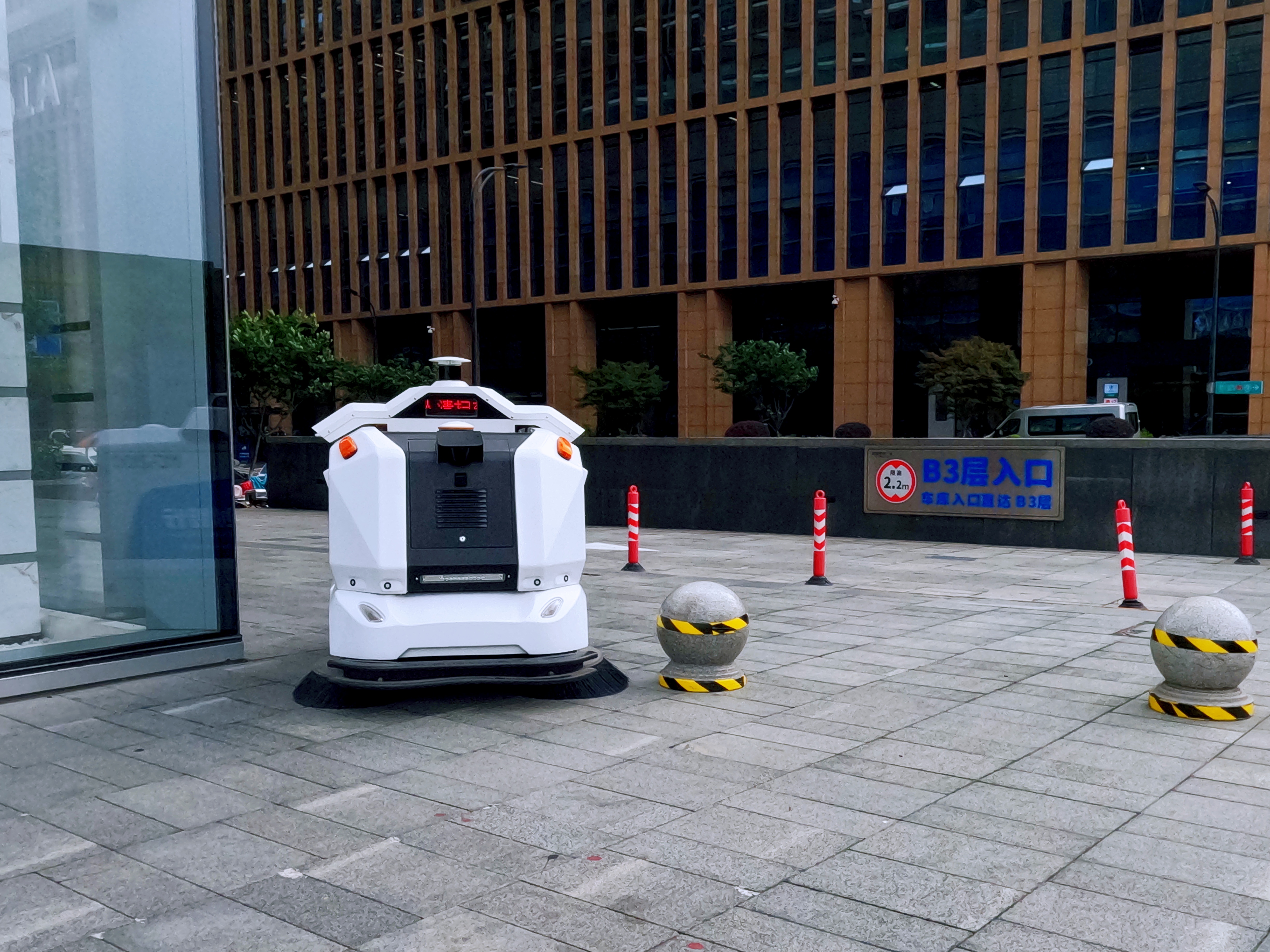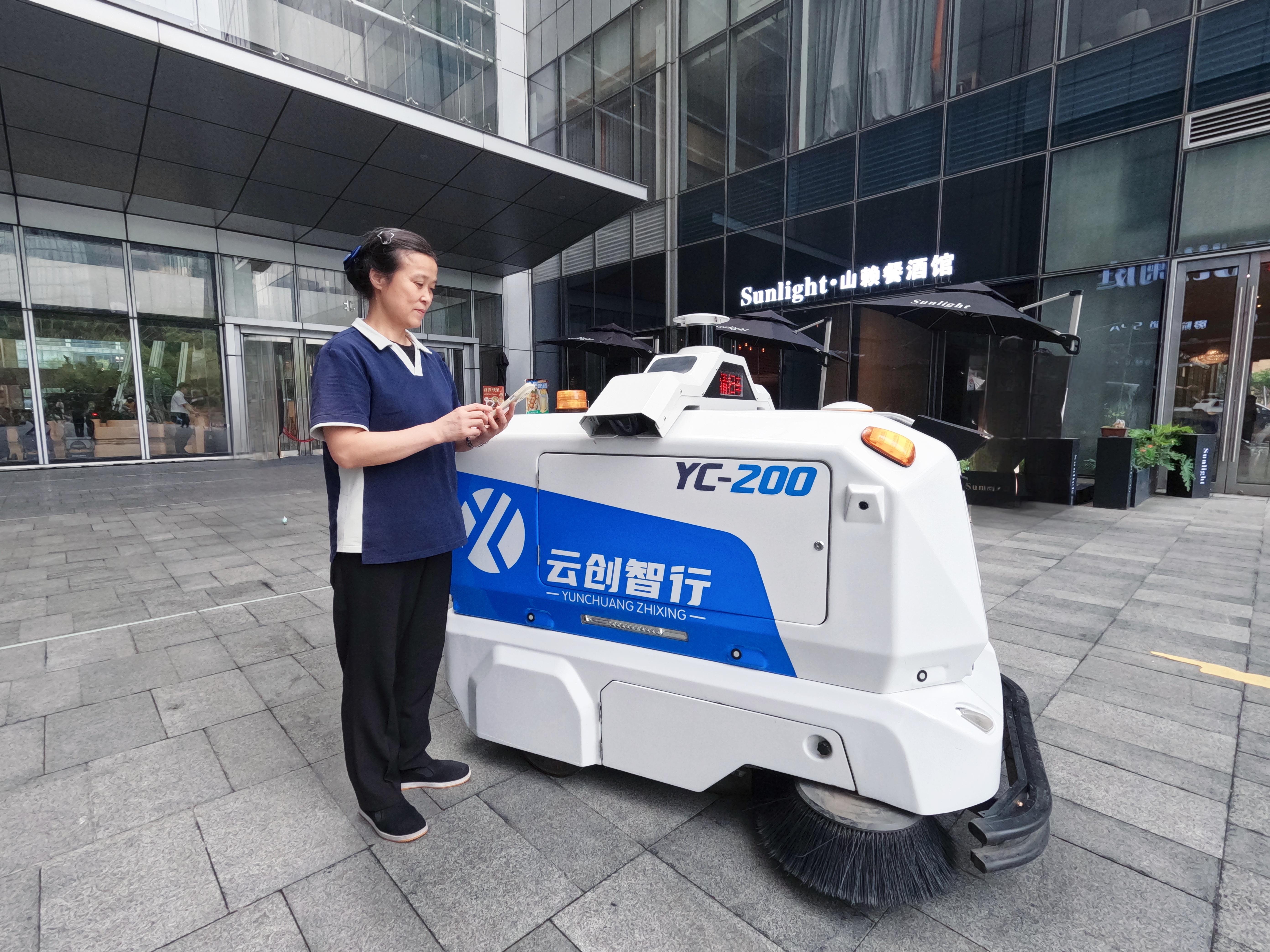 ?室外無人清掃: 云創無人駕駛清掃車繼續擔當室外公共區域的主力軍,風雨無阻,精準高效完成大面積廣場清掃任務。